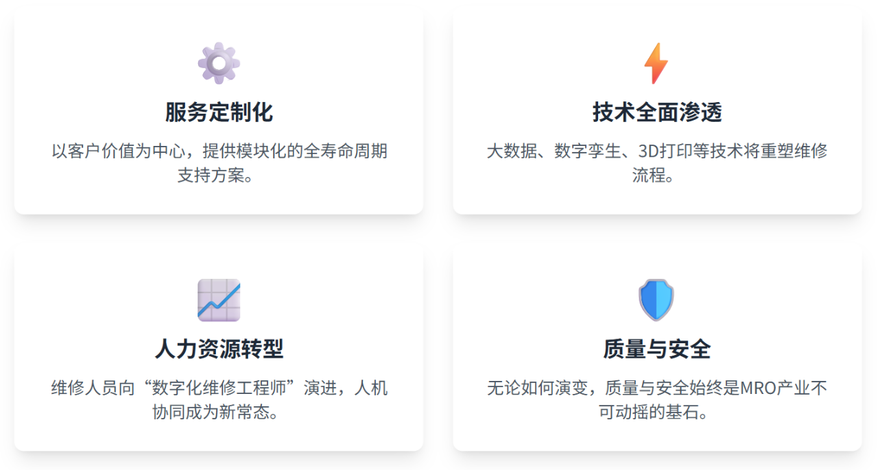 展望未来,MRO行业将是高科技驱动、全球融合发展的图景。服务将更定制化,技术应用(PHM、数字孪生、3D打印)将全面渗透,人力资源将转向数字化维修工程师和人机协同模式。最终,无论商业和技术如何演变,质量与安全始终是MRO产业一切演进的基石。