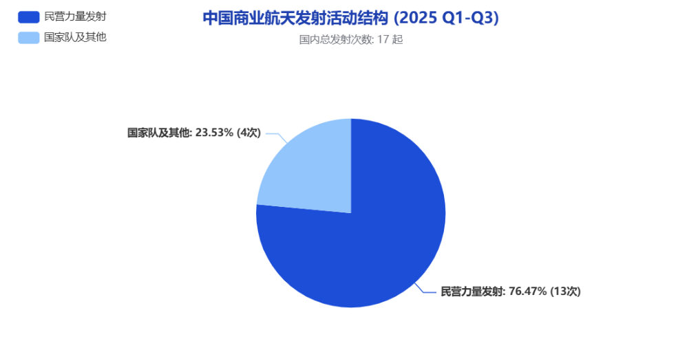 第一季度(Q1,1月-3月)总计: 56起;第二季度(Q2,4月-6月)总计: 68起;第三季度(Q3,7月-9月)总计: 73起。数据显示,从Q1的到Q3,发射频率持续攀升,体现了行业强大的工业化部署能力。特别地,第三季度月均发射次数超过24次,创下同期历史新高。这一趋势的核心驱动因素在于大型低轨卫星星座的常态化部署任务,使得商业发射已演变为一种高频的太空物流服务。