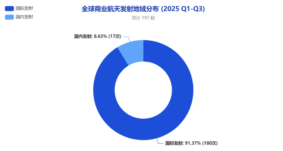 2025年前三季度,根据航空产业网“经度”系统的监测统计,全球商业航天火箭发射相关动态达197起。发射频率的常态化以及重型、可重复使用运载火箭技术的加速成熟,标志着太空进入一个全新的工业化部署周期。