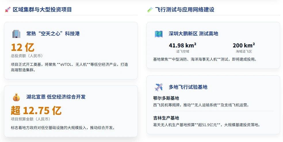 1. 区域集群与大型项目密集启动12亿级园区开工:常熟“长江汇融·空天之心”科技港产业园开工奠基,总投资12亿元,聚焦eVTOL、无人机等低空经济产业,将打造高端智造集群。百亿级基建投资:湖北宣恩县低空经济综合开发项目预算超12.75亿元,吉林葛天无人机生产基地项目预算超51.9亿元,标志着地方政府对低空基础设施的大规模投入。