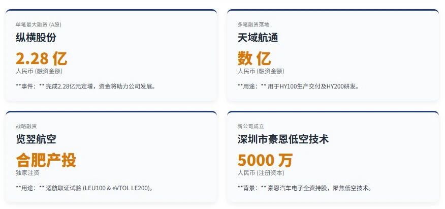 单笔超2亿:纵横股份完成2.28亿人民币,融资金额达2.28亿人民币,投资方为川发证券基金。新公司成立:深圳市豪恩低空技术有限公司成立,法定代表人为汪秀丹,注册资本5000万人民币,由深圳市豪恩汽车电子装备股份有限公司全资持股。