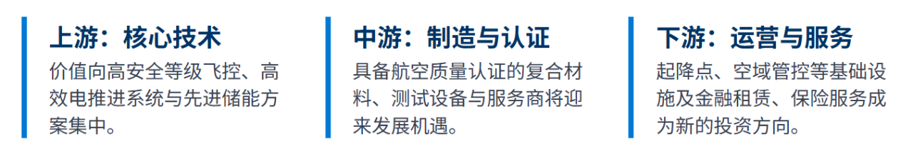 未来2.5吨级机型技术路线将收敛于复合翼和倾转旋翼,首批TC证书有望在2026年前后获批,推动产业进入初步规模化阶段。价值链将向上游的高安全等级飞控、电推进等系统集中。中游配套商需具备航空质量认证,下游则将重点发展低空基础设施、金融租赁和运营服务体系。行业重心正由技术可行性转向“可运营、可量产”的成熟阶段。