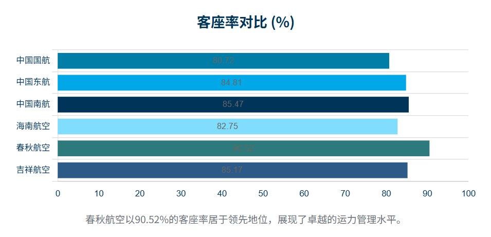 回顾2024年全年:三大航(国航、东航、南航)在2024年全年同样是大幅减亏,但仍面临净亏损。而春秋航空和吉祥航空在2024年全年已实现稳健盈利(净利润分别为22.73亿元和9.14亿元)。减亏驱动因素:三大航减亏的关键财务贡献主要来自国际市场爆发式恢复和平均航油价格同比下降。二、运营效率对比:低成本航司的结构性优势运营效率是决定盈利的核心要素。客座率领先: 春秋航空以90.52%的平均客座率遥遥领先所有竞争对手。