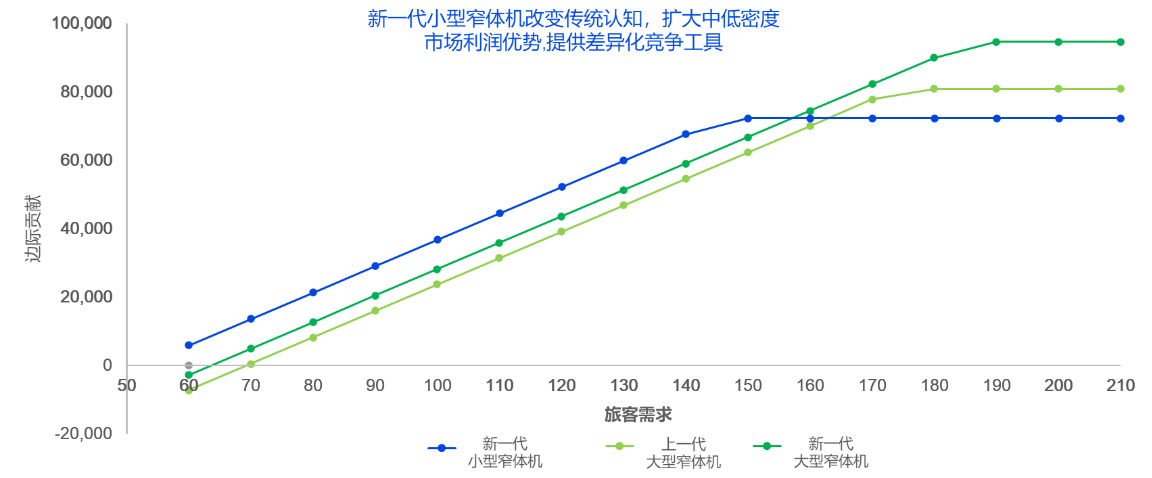 相比之下,新一代小型窄体机通过技术升级大幅降低了运行成本,有效扩大了在中小密度市场的边际贡献优势,为市场提供了更高效的运力工具。因此我们认为,未来新一代窄体飞机将更好地助力航空公司进行差异化竞争,提升低客流航空市场的整体盈利能力。