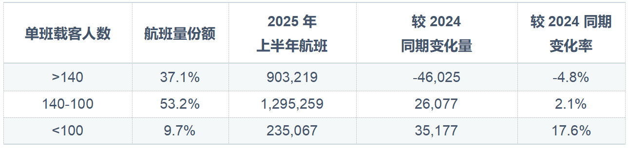 进一步分析2025年上半年所有航班的实际载客情况可以发现:单班载客140人以下的市场维持正增长,100人以下市场增长尤为迅速;而单班载客140人以上的市场则出现同比下滑。这表明客流在单班载客人数上出现分散趋势。