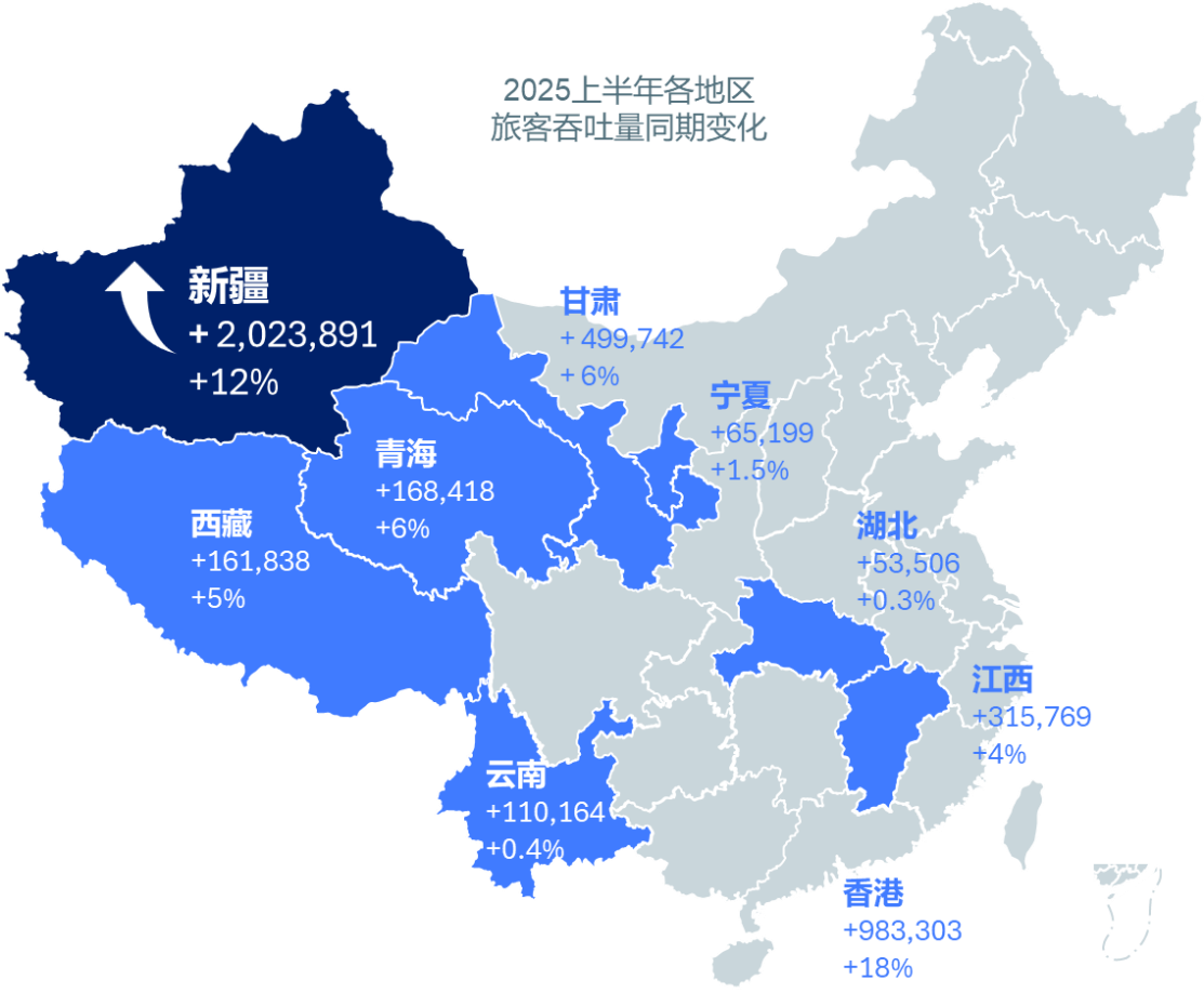 2025年,航空市场呈现“西北热”现象,新疆表现尤为突出。与此同时,湖北、江西、云南市场的航线网络也发生结构性变化,带来新的增长点。香港与内地城市间的航空连接进一步加密。