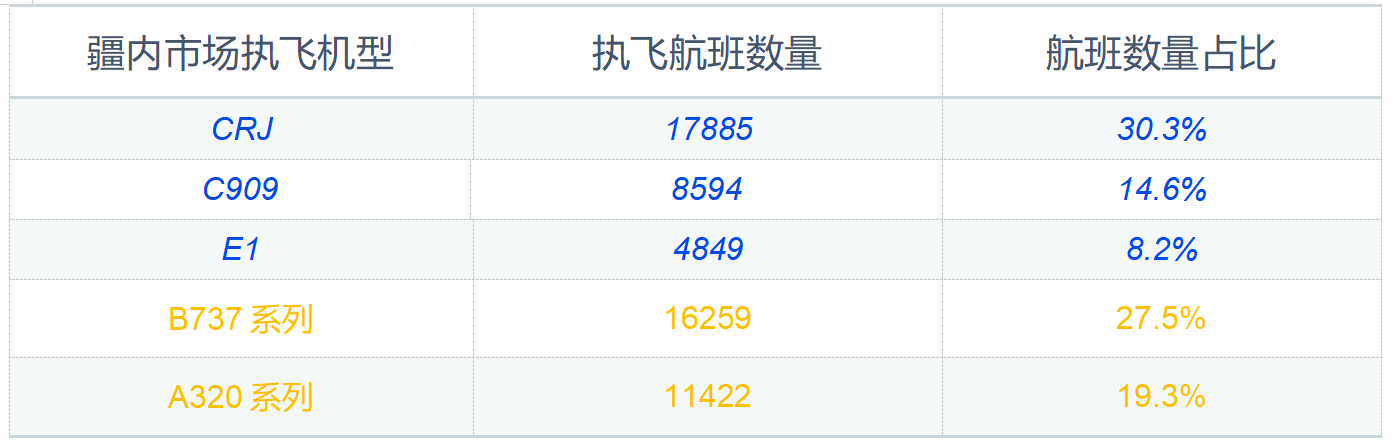 在疆内互飞串飞航班中,几乎所有航班的单班载客量均低于140人。执飞机型方面,53%由CRJ、C909和E1系列飞机执飞,47%由B737和A320系列执飞。近半数航班使用大型窄体机,表明疆内市场存在显著的座级与需求错配。