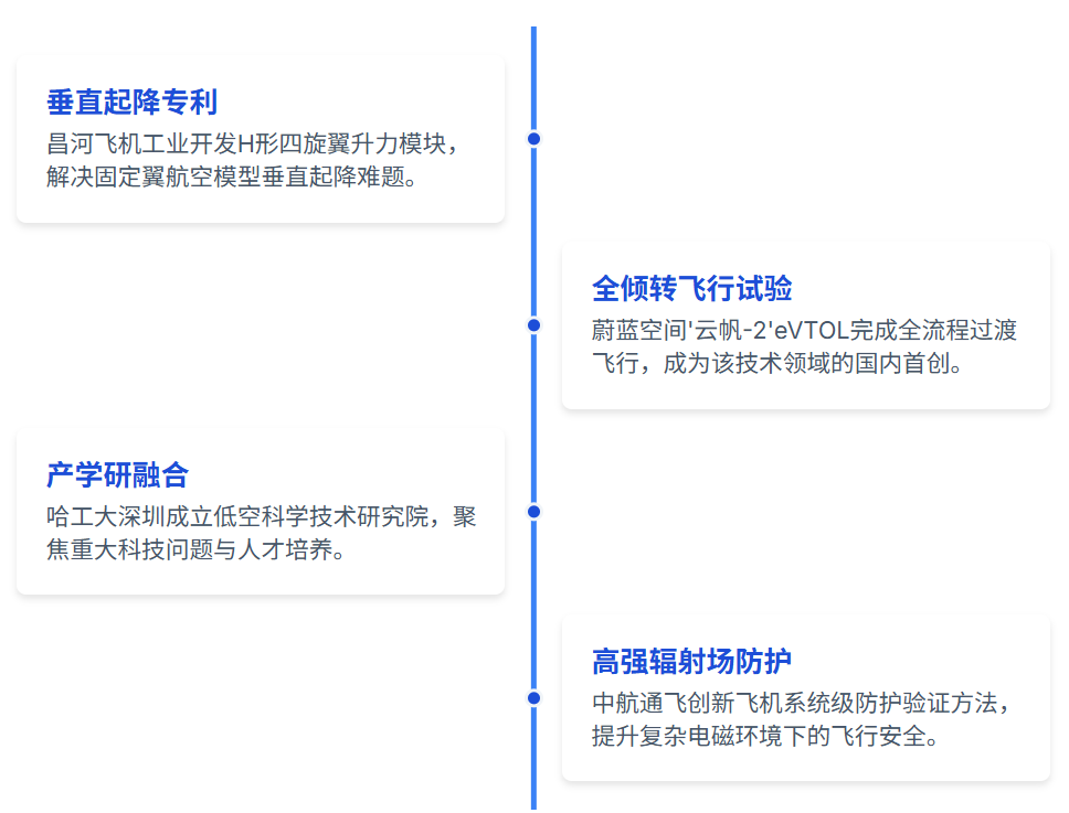 企业及研究机构在 eVTOL、无人机垂直起降和防护技术领域取得进展,包括飞行试验、专利开发和平台建设。这些创新提升飞行器性能与安全性,为商业应用奠定技术基础。