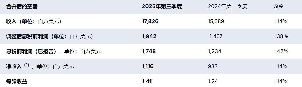 2025 年第三季度收入增长 14%,主要反映了空客防务与航天业务量增加、直升机交付量增加以及商用飞机交付量增加。